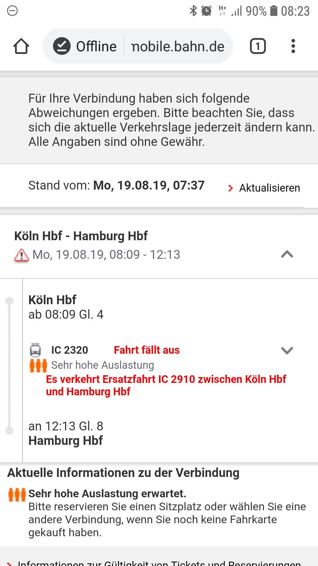 - D’r Zoch kütt nit … 19.08.2019 08:33:12Leider nicht, dafür ein Ersatz ICE. Platz fürs Fahrrad ist gegeben, der reservierte Sitzplatz durch genügend andere freie Plätze ersetzt. Was möchte man mehr.