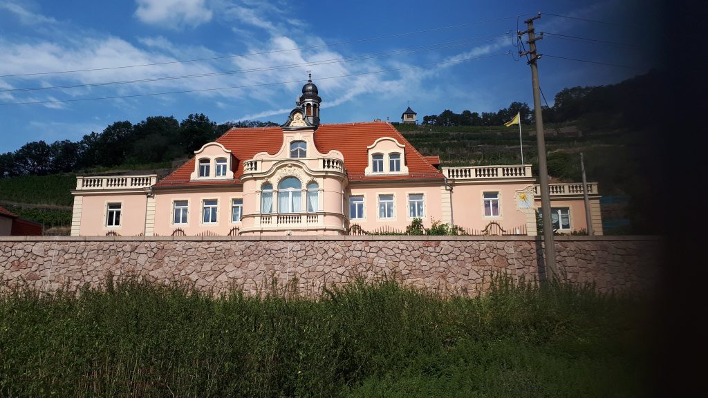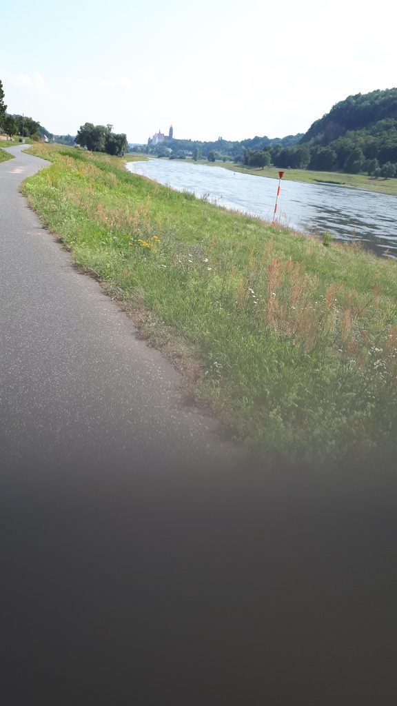 Nach dem Ort Sörnewitz scheint sich mir die Landschaft zu ändern. Kleine Berge rechts und links der Elbe erheben sich, zwischendrin einige schöne Gebäude.