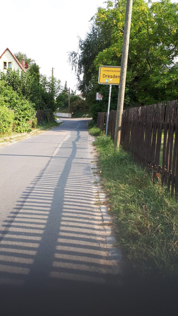 Ich suche ein Hotel per Telefon, ausgebucht, ausgebucht, … Ja, für 2 Nächte ist ein Zimmer frei, Hotel Wyndham Garden Dresden. Ich fahre nach dem erneuten Befüllen meiner Trinkflasche in einem Sonnenstudio – Danke Susi – direkt los. Aus gedachten 4 km werden laut Google 6 km. Kein Problem denke ich. Es geht in den südwestlichen Teil von Dresden, also durch die Neustadt, auf die andere Elbeseite, vorbei am Stadion und Zoo. Doch was nun, es geht leicht bergauf. Das leicht verschwindet, dafür kommt schwer. Und es scheint kein Ende zu nehmen. Es wird kurvenreicher, steiler und steiler. Der letzte Kilometer lässt meine Lunge leer werden. Ich bin nicht einmal während der ganzen Fahrt wegen kleiner Berge abgestiegen, also jetzt auch nicht mehr. Ich kämpfe mich hoch zum Hotel, endlich angekommen. Abgestiegen, nur den Rucksack unter den Arm, ab an die Anmeldung. Und dann nach draußen an die Bar und trinken, trinken, trinken, … Apfelwasser hilft. Das Ziel ist erreicht.