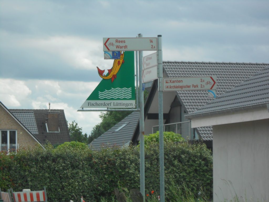 Plötzlich ertönen hinter uns laute Rufe, wir verstehen jedoch nichts. Der Wind lässt alles zu einem Rauschen ertönen. Wir warten bis die Laute verständlich werden. Hi, das gelbe Trikot und sein Partner. Während wir schmunzeln rasen die Zwei zu uns. Nach einer Begrüßung stellen wir fest: es sind Vater und Sohn aus Madrid. Mit dem Flugzeug nach Basel, von dort den Rhein runter bis Rotterdam, so der Wunsch. Der Sohn hat ein modernes Rennrad, so wie man es heute fährt. Der Vater ist mit einem ca. 30 oder 40 Jahre alten Rad unterwegs, vorne ein Gang und hinten ein Gang. Also immer die gleiche Übersetzung, egal ob bergauf oder Berg runter. Damit sei er bereits seit vielen Jahren unterwegs und er hat stets seine Ziele erreicht. Seit 10 Tagen und 1100 Kilometer sind es nur noch Zwei Tage bis Rotterdam, dann mit dem Zug nach Amsterdam und von dort via Flieger nach Madrid. Auf englisch erklären wir, es sei besser links-rheinisch zu bleiben. Doch sie möchten lieber auf der rechten Seite fahren.Die beiden haben eine tolle Karte dabei: ein Faltblatt, DIN A5 oder kleiner, eine blaue Linie darauf mit ein paar Städtenamen: Basel – Karlsruhe – Heidelberg – Bonn – Düsseldorf – Nijmegen – Rotterdam oder so. Ich schenke ihnen meine Radkarte „Köln – Rotterdam“ mit detaillierten Infos. Nach einem Zögern wird diese angenommen und jedes Team fährt seinen Weg. Die zwei Richtung Nijmegen – ihr heutiges Ziel – wir nach Elten.