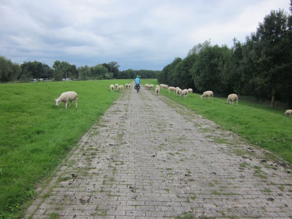 Kurz hinter Moers noch ein paar Backwaren kaufen – für die Verpflegung unterwegs. Beim Einpacken der Leckereien rasen zwei Radfahrer an uns vorbei, der Ältere im gelben Trikot, der Jüngere in seinem Windschatten. Und beide mit Rennrädern aber einigem Gepäck darauf. Aber warum mit so einem Speed? Verwundert folgen wir in gleiche Richtung – nur langsamer.