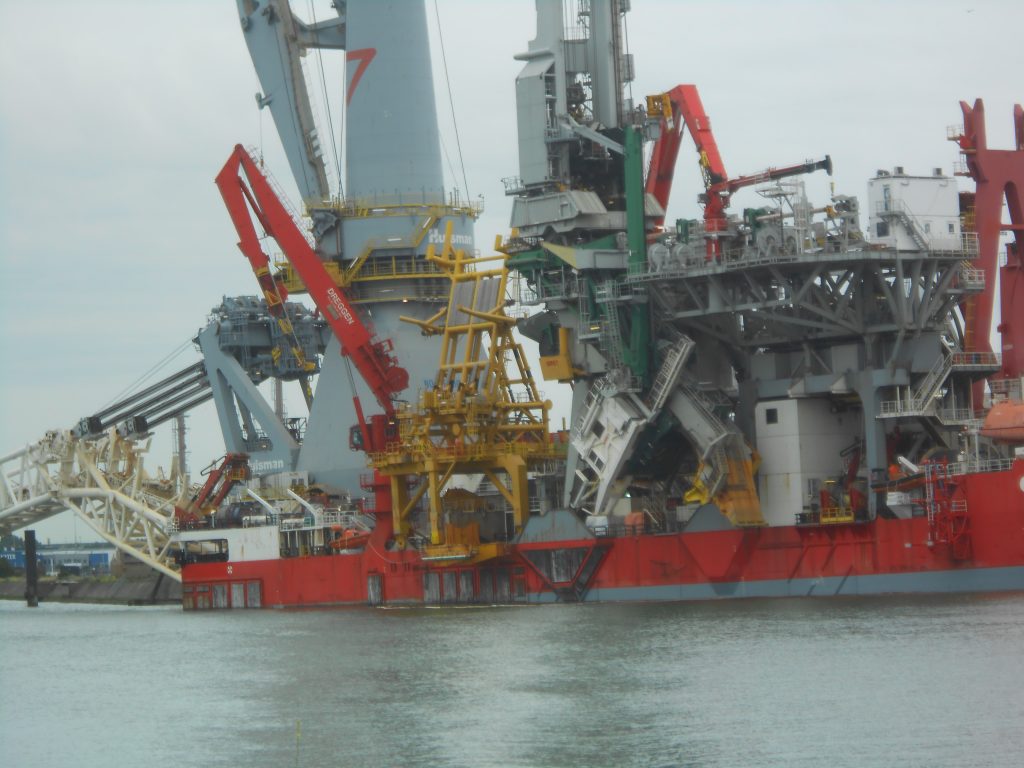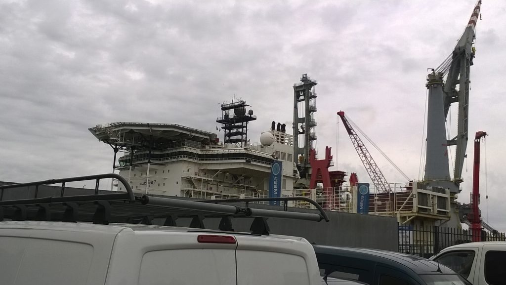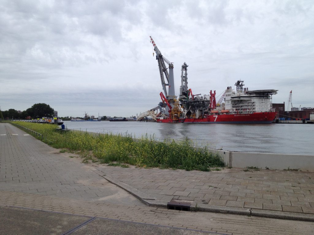 Der nächste Haltepunkt ist das Unternehmen Franklin Offshore Europe B.V.. Wir fuhren einfach der Nase nach, erneut durch ein kleines Dorf namens Heijplaat. Kleine Häuse, kleine Strassen, ruhiges Leben. Am Ende des Dorfes fuhren wir auf den Hof von Franklin Offshore und konnten hinter der großen Montagehalle ein Schiff erkennen. Mit Hubschrauberlandeplatz und vielen Kränen drum herum. Unser technisches Interesse wurde geweckt. Das Ergebnis: die „Subsea 7 Seven Borealis„.