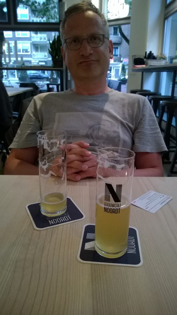 Unsere Hafentour neigt sich dem Ende zu und wir fahren zurück in die Herberge. Wir machen uns fit für den letzten Abend mit dem Wunsch: ein gutes Essen, dann ein oder zwei Bier und gemeinsam mit den Niederländern Champignons-League schauen – Amsterdam spielt heute Abend. Wir besteigen eine Straßenbahn und kaufen unser Ticket direkt beim Kontrolleur – ja dies ist hier so. Wir fragen den freundlichen Herrn, welche Haltestelle wir nutzen sollten, um unser Begehren erfüllt zu bekommen. Ganz einfach: Ausstieg Vlietlaan. Dort findet ihr die Bäckerei (!?) Jordy’s. Und nach dem Essen geht ihr auf die andere Straßenseite ins Café Klapdeur De. Eine einheimische Kneipe, wo jung und alt gemeinsam nicht nur Fußball gucken. Im Jordy’s bekommen wir eine tolle Pasta und ich genehmige mir als Nachtisch einen Super-Brownie aus dem bereits geschlossenen Kühlschrank – der ist nur geöffnet wenn Brot und Kuchen verkauft werden, abends nur für Sondergäste. Der lieben Bedienung ein Dankeschön dafür. Was uns besonders in der Bäckerei gefiel, war, dass es neben Nudelgerichte auch Bier gab. Als wir das Lokal betraten, sagten wir, wie sehr wir uns auf unser „Kölsch“ freuen, wenn wir wieder daheim sind. Doch bereits 5 Minuten später standen auf unseren Tisch die wohl bekannt Gläser.