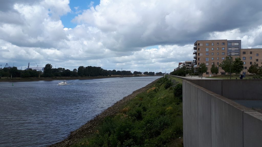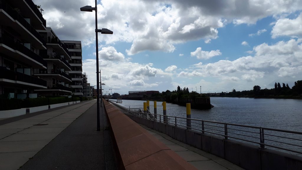 Anscheinend entsteht hier im nördlichen Teil von Bremen so etwas wie der Köln Rheinau-Hafen. Moderne Büro- und Wohngebäude werden hier errichtet bzw. wurden bereits fertig gestellt. Was fehlt sind die typischen Kran-Häuser. Der Blick nach Süd-Ost: