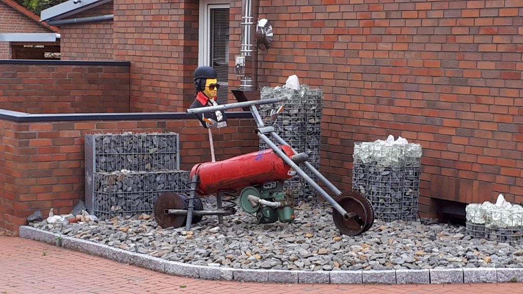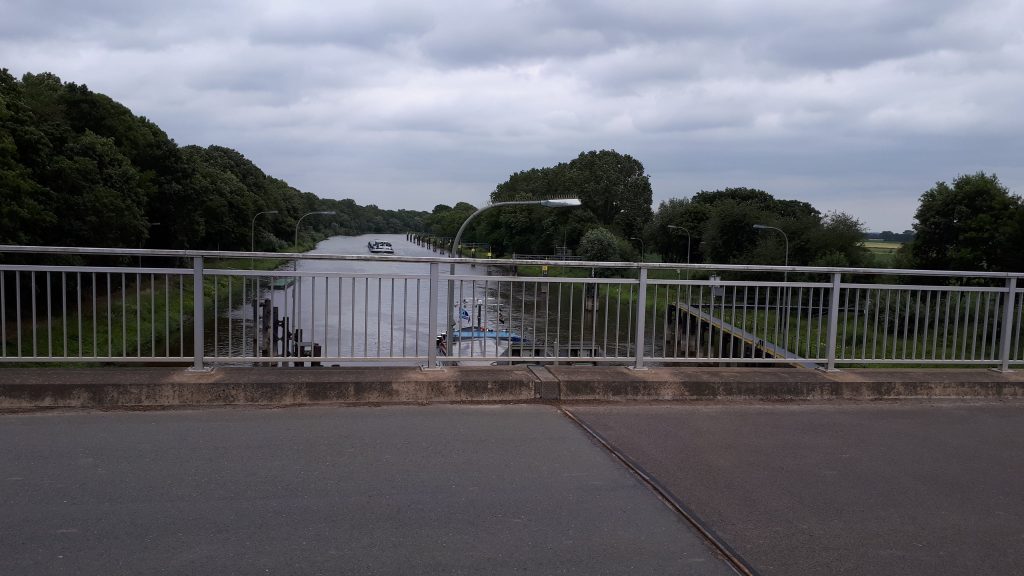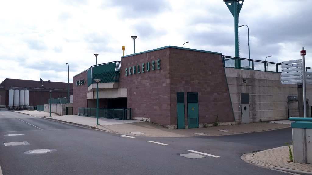 An der Weser-Schleuse kommen weitere Radler vorbei: eine Gruppe junger Männer und ein Einzelfahrer wie ich. Später treffe ich ein Paar und eine Gruppe mit Personen aus drei Generationen. Anscheinen, nein sicher, aus Köln kommend. Man hörte bei einem Fahrer die FC-Hymne, als ich unterwegs zu einer Brötchen-Pause anhielt. Mein „Effzeh“ wurde willkommen entgegen genommen. Ein Schweizer, der wenn alleine mit hoher Geschwindigkeit, die letzten 7 bis 8 Kilometer bis Nienburg fuhr. Manche trifft man mehr als ein Mal.