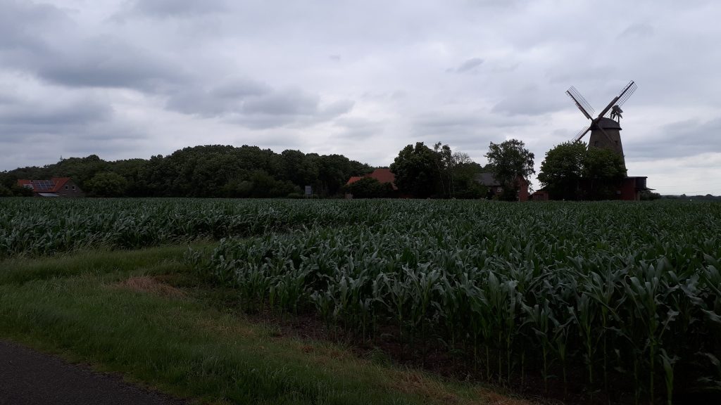 Mehr Rücken- als Gegenwind lässt mich zügig vorwärts kommen. Doch es sieht immer so aus, als wenn es in den nächsten Minuten stark regnen wird. Und die Temperatur ist stark gefallen. Ich denke mit meinen kurzen Hosen lässt sich dies nicht jeden Tag durchführen. Ich erreiche Petershagen und fahre nun den bisher schönsten Abschnitt bis Stolzenau und weit dahinter. Hier eine Mühle kurz hinter Petershagen: