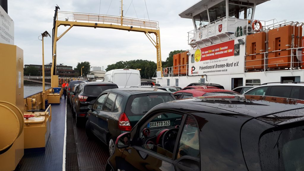 Als Ende des Tages war gedacht, zur Fähre nach Vegesack zu fahren. Dort nach Lemwerder rüber zu setzen und zu nächtigen. Der Weg durch Bremen ist super. Man kann einen 50 bis 100 Meter breiten, jedoch mehr als 4 km langen Park durchfahren. Man sieht viele Menschen die dort spazieren oder kommunizieren. Kein Auto, kein LKW, keine Ampel. Einfach klasse. Kurze Z eit später fährt man nicht mehr neben der Weser sondern neben dem Fluss Lesum. Er mündet in die Weser ganz nah bei der Fähre. Jedoch fing es hier an zu regnen. Ich hielt an und schlüpfte unter einem Baum in meine Regensachen. Einige Meter entfernt war eine kleine Hütte, eine Umkleidekabine eines nahe liegenden Sportplatzes. Ich sah eine Person unter dem Vordach stehen und gesellte mich zu Sarah. Sarah musste noch 6 km joggen, um ihren temporären Bleibeort zu erreichen. Eigentlich kommt sie aus Cuxhaven, meinem Endziel. Unsere Kommunikation verlief sehr lustig, wir haben einige Sätze über Radfahren und Joggen, Regen, Corona, … ausgetauscht. Fast verpassten wir das Ende des Regens. Nach einiger Zeit hatte ich nun auch meine Schuhe gewechselt und konnte gut geschützt weiter fahren. Die amüsante Unterhaltung wurde beendet, ich ließ Sarah alleine unter dem Vordach und fuhr zur Fähre.