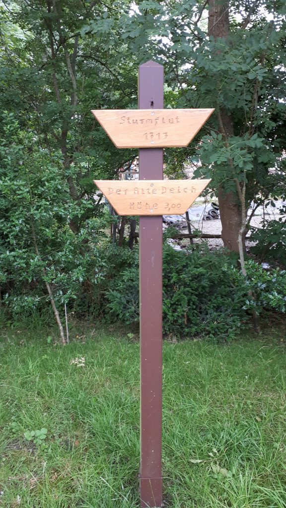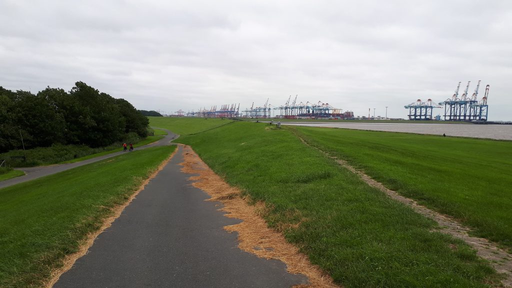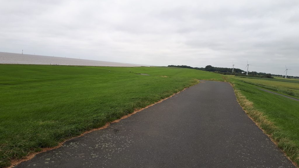 Am Deich angekommen geht es nach Norden und siehe da, der Wind kommt vom Süden! Hervorragend! Der Weg geht rechts vom Deich entlang, oben ist nicht, da gesperrt. Es sind wenige Menschen unterwegs, mehr Autofahrer als Radler. Erstmal ein Blick zurück:
